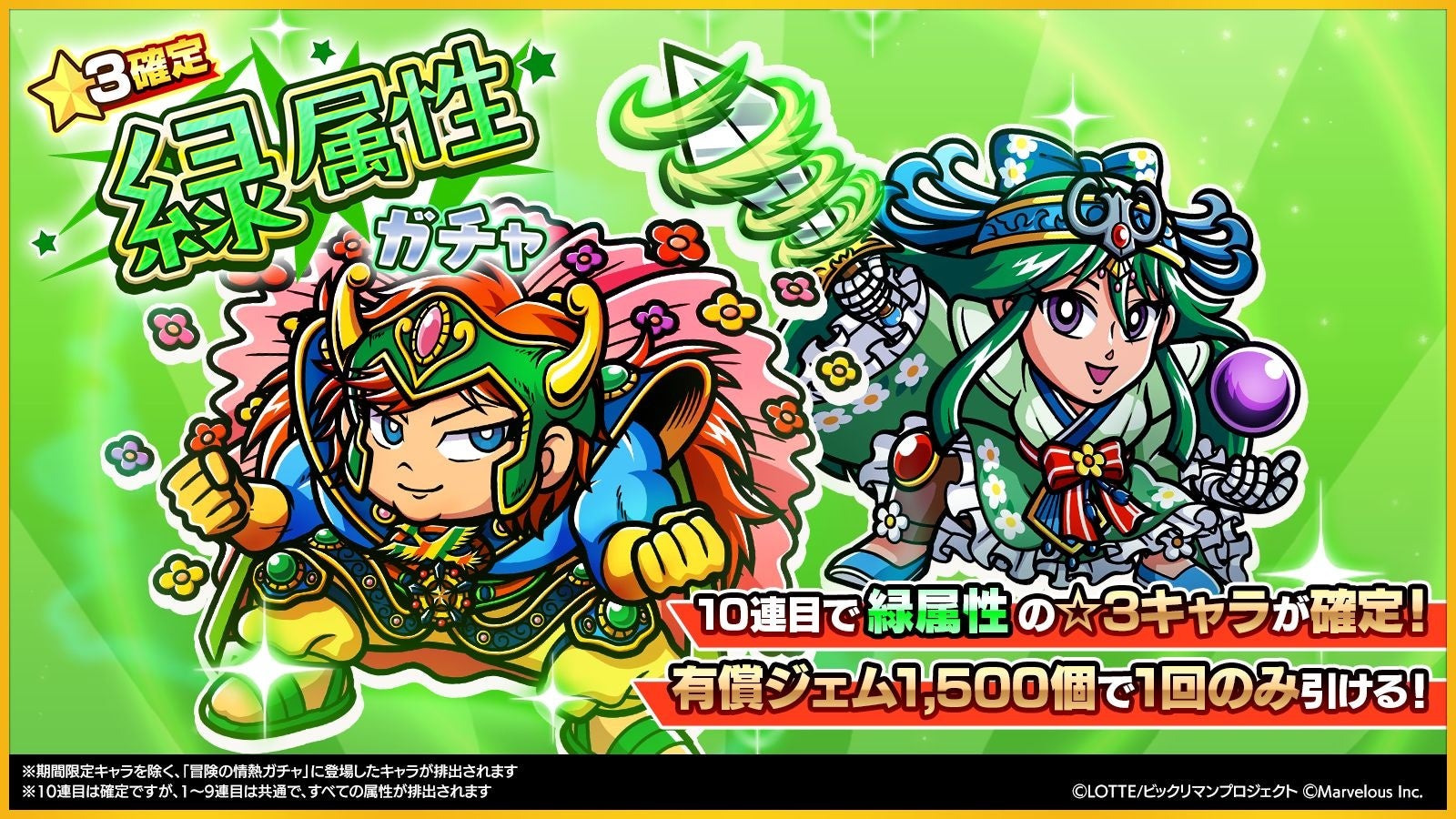 1回限定で、有償ジェム1,500個で回せる「☆3確定 緑属性ガチャ」を開始いたしました。