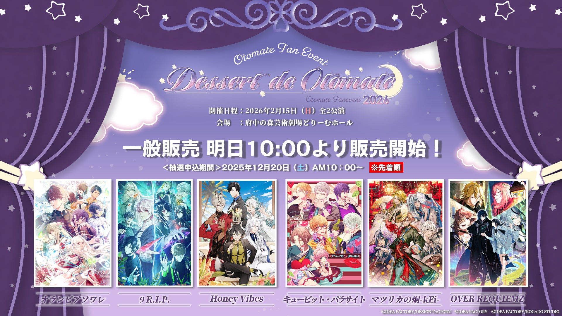 アイディアファクトリー株式会社(代表取締役社長:佐藤 嘉晃/所在地:東京都豊島区)の女性向けゲームブランド「オトメイト」は、2026年2月15日(日)開催予定のオトメイトファンイベント「Dessert de Otomate 2026」の会場チケット一般販売が明日12月20日(土)より開始することをお知らせいたします。
