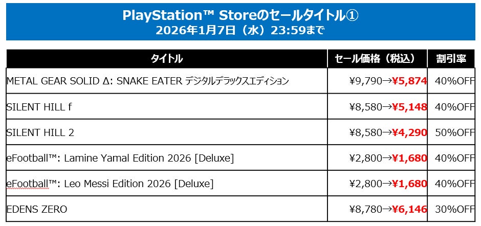 今年発売した『SILENT HILL f』、『METAL GEAR SOLID Δ: SNAKE EATER』、『ときめきメモリアル~forever with you~ エモーショナル』がそれぞれ40%オフと大変お求めやすくなっています。