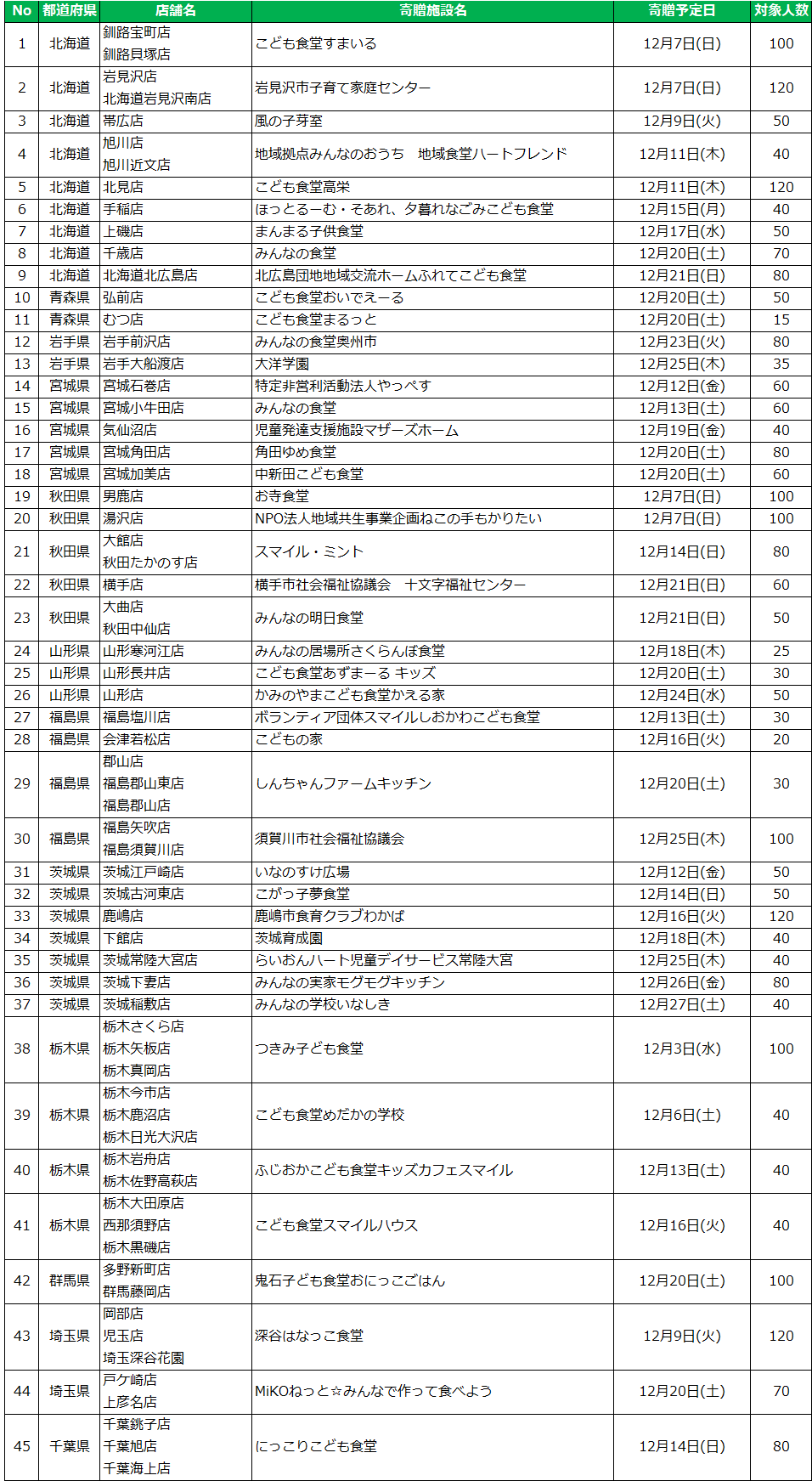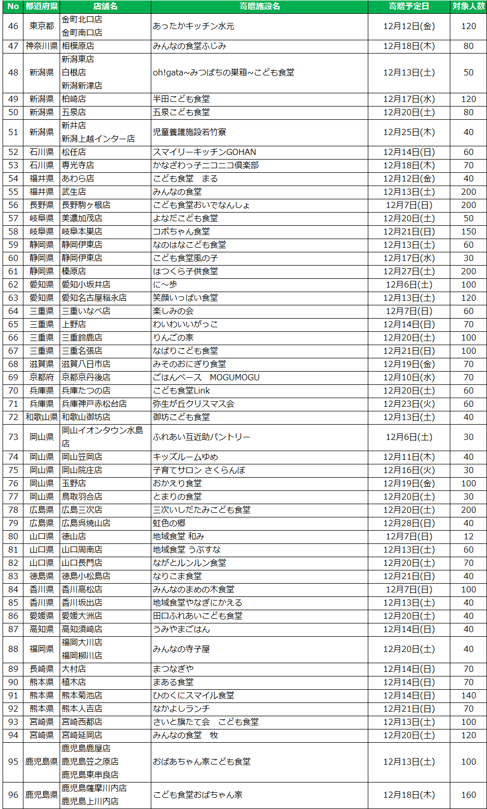 このたびの活動は、社会貢献活動の一環として、店舗周辺の子ども食堂や福祉施設へクリスマスのお菓子を寄贈するものです。寄贈時には、当社従業員が施設を訪問し、施設スタッフ様と協業でクリスマス会等のイベントを開催いたしました。また、寄贈品については、「令和6年能登半島地震」ならびに「令和7年8月熊本豪雨災害」により甚大な被害を受けた石川県、熊本県の菓子製造会社から購入することで、復興支援につなげるとともに、被災地の現状を伝え、支援の輪を風化させることなく全国へ広げていきたいと考えております。