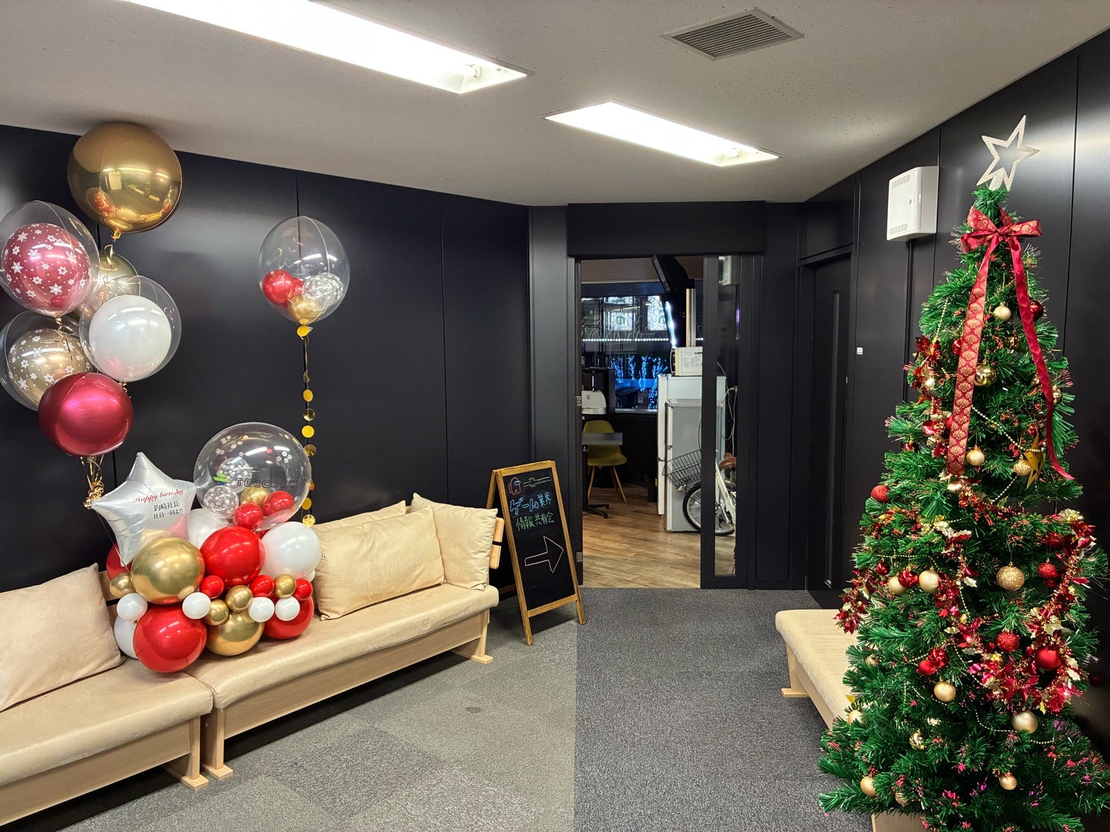大きなクリスマスツリーや、イベント前日にテコテック社長 釣崎様がお誕生日を迎えられたとのことで