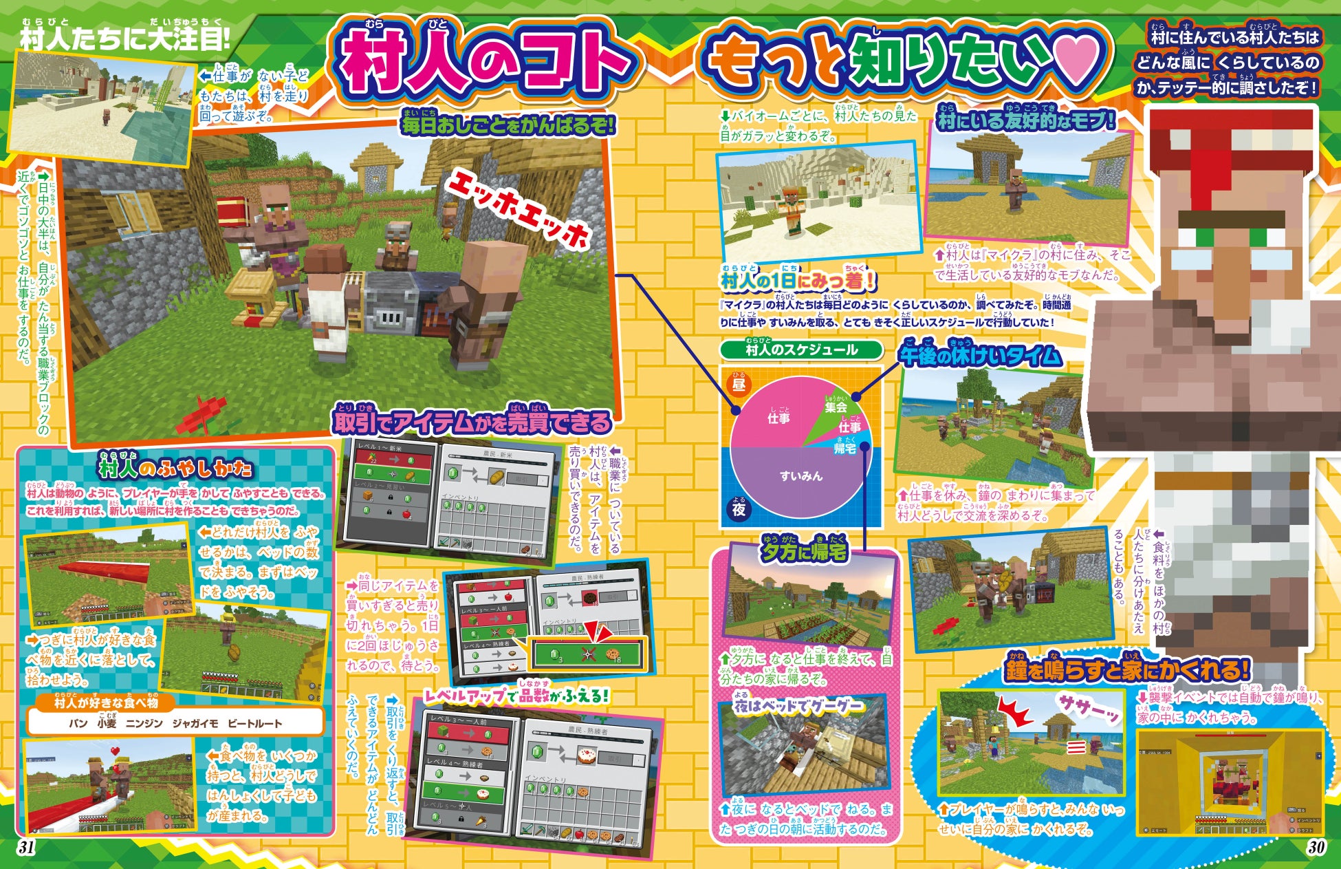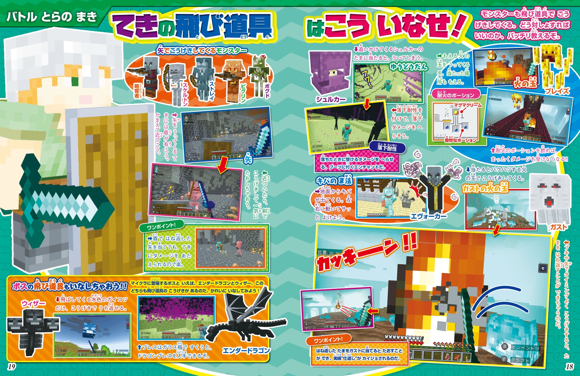 などなど、『マイクラ』をプレイするときに知っておきたい情報をわかりやすく伝えます。また、踊るモブに注目したり、いつもと違った攻撃方法の提案など、攻略サイトには無い雑誌ならではのオモシロ記事も。