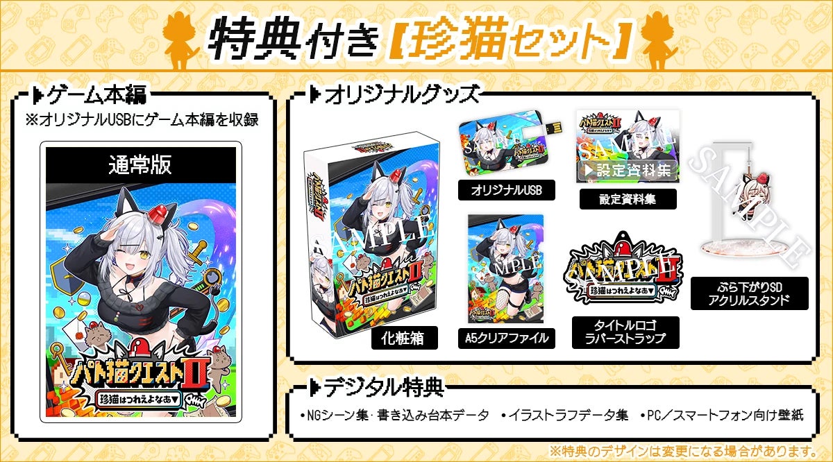 予約販売中の『パト猫クエストⅡ 珍猫はつれえよなあ』の「珍猫セット」は、VTuber「猫元パト」(ねこもと ぱと)さんが主演・声優を務めるノベルゲームの本編に加えアクリルスタンドや設定資料集など多数の豪華特典が同梱されたパッケージ商品です。今予約販売していただければ、先行予約特典として「限定ポストカード」を購入者全員にプレゼントするほか、抽選で「直筆サイン色紙」を5名様にプレゼントします。