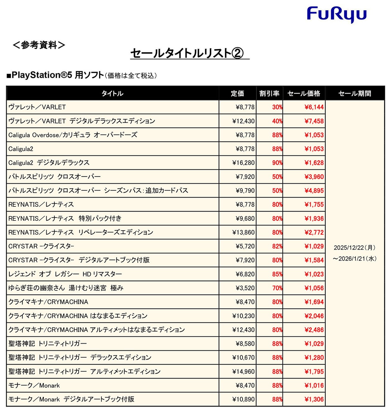 フリューの王道RPGシリーズ『レジェンド オブ レガシー HDリマスター』、『聖塔神記 トリニティトリガー』、『アライアンス・アライブ HDリマスター』と、オリジナルRPG『Caligula2/カリギュラ 2』、『モナーク/Monark』などのNintendo Switch™版が990円(税込)~になる他、最新作『ヴァレット/VARLET』や話題作『REYNATIS/レナティス』『クライマキナ/CRYMACHINA』も過去最大割引など、ダウンロードソフト各種がお得な価格にてお買い求めいただけます。