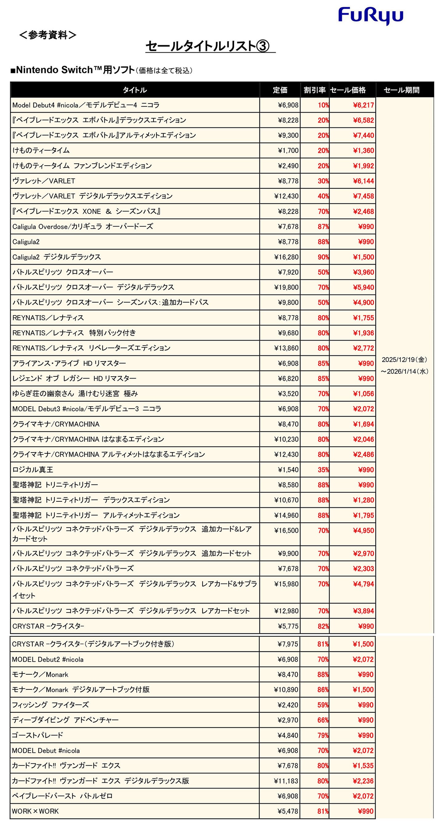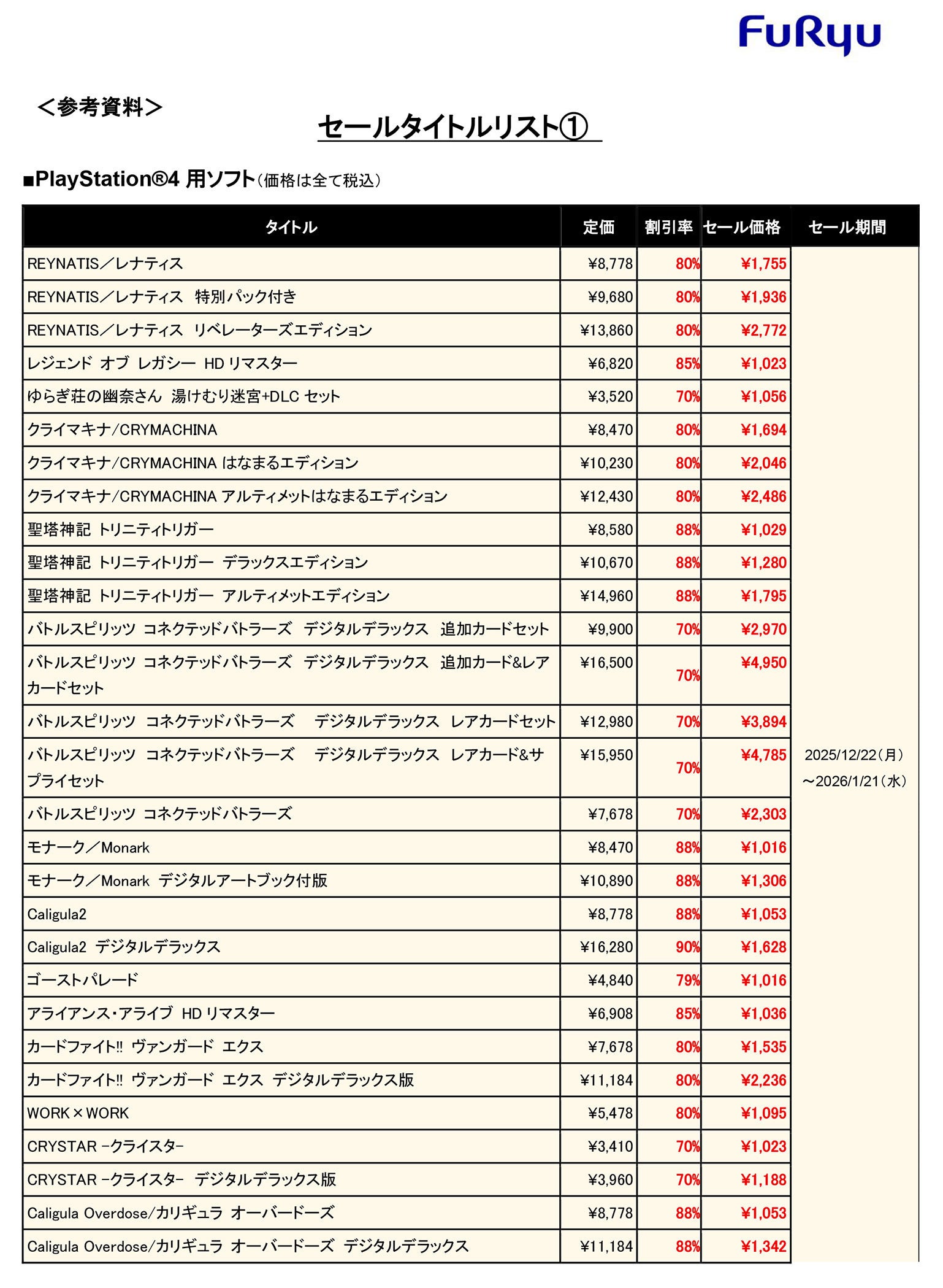 フリューの王道RPGシリーズ『レジェンド オブ レガシー HDリマスター』、『聖塔神記 トリニティトリガー』、『アライアンス・アライブ HDリマスター』と、オリジナルRPG『Caligula2/カリギュラ 2』、『モナーク/Monark』などのNintendo Switch™版が990円(税込)~になる他、最新作『ヴァレット/VARLET』や話題作『REYNATIS/レナティス』『クライマキナ/CRYMACHINA』も過去最大割引など、ダウンロードソフト各種がお得な価格にてお買い求めいただけます。
