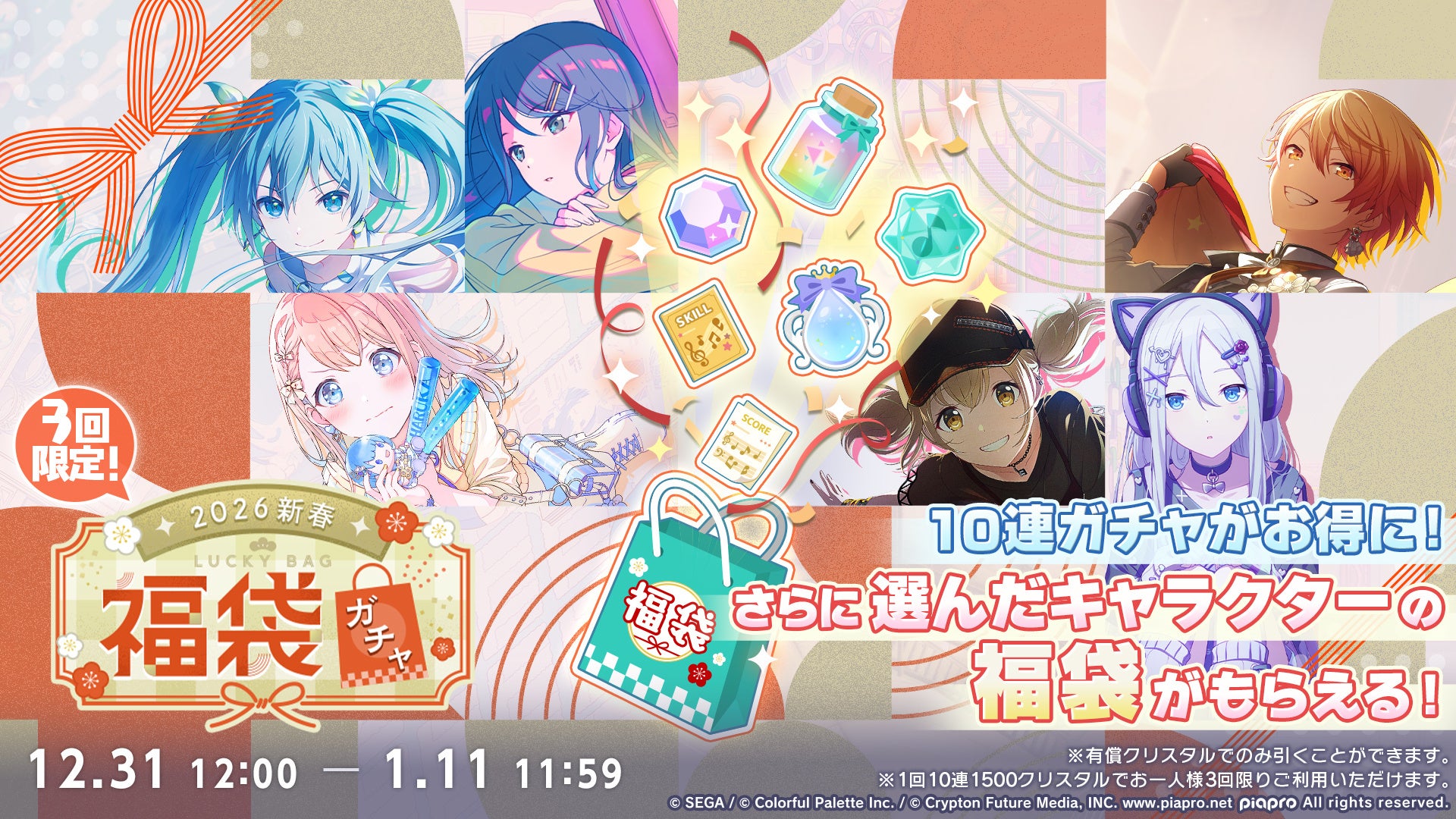 新春記念セールとして、クリスタルを期間限定でお得に販売いたします。さらに、豪華アイテムが入った「2026新春福袋」を4種類販売いたします。プロセカ公式ストアでのみ購入可能となるお得な「新春デラックスセット」も登場いたしますので、ぜひご確認ください。