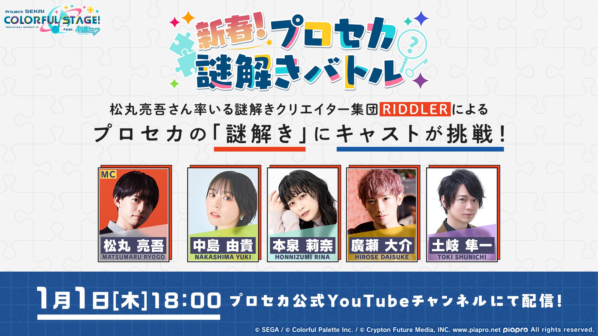 プロセカ公式YouTubeチャンネルにて、松丸亮吾さん率いる謎解きクリエイター集団「RIDDLER」が手掛ける『プロジェクトセカイ』の謎解きに、日野森志歩役の中島由貴さん、日野森雫役の本泉莉奈さん、天馬司役の廣瀬大介さん、神代類役の土岐隼一さんが挑戦する番組「新春! プロセカ謎解きバトル」の配信が決定いたしました。お正月はぜひ『プロジェクトセカイ』の謎解きをお楽しみください!