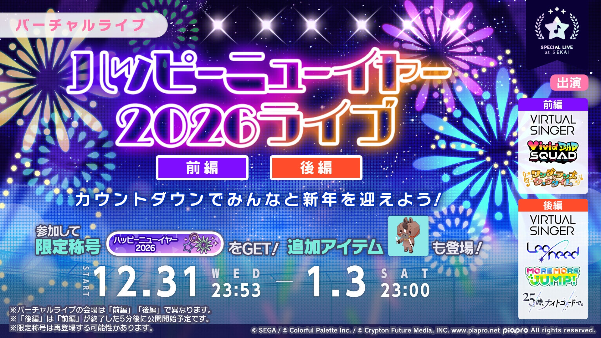バーチャルライブにて、「ハッピーニューイヤー2026ライブ」を前編・後編の2回に分けて開催いたします。本バーチャルライブに参加すると、限定称号「カウントダウン2026」や「想いのカケラ」が手に入るほか、バーチャルショップでは、午の着ぐるみのアバターアイテムを販売いたします。