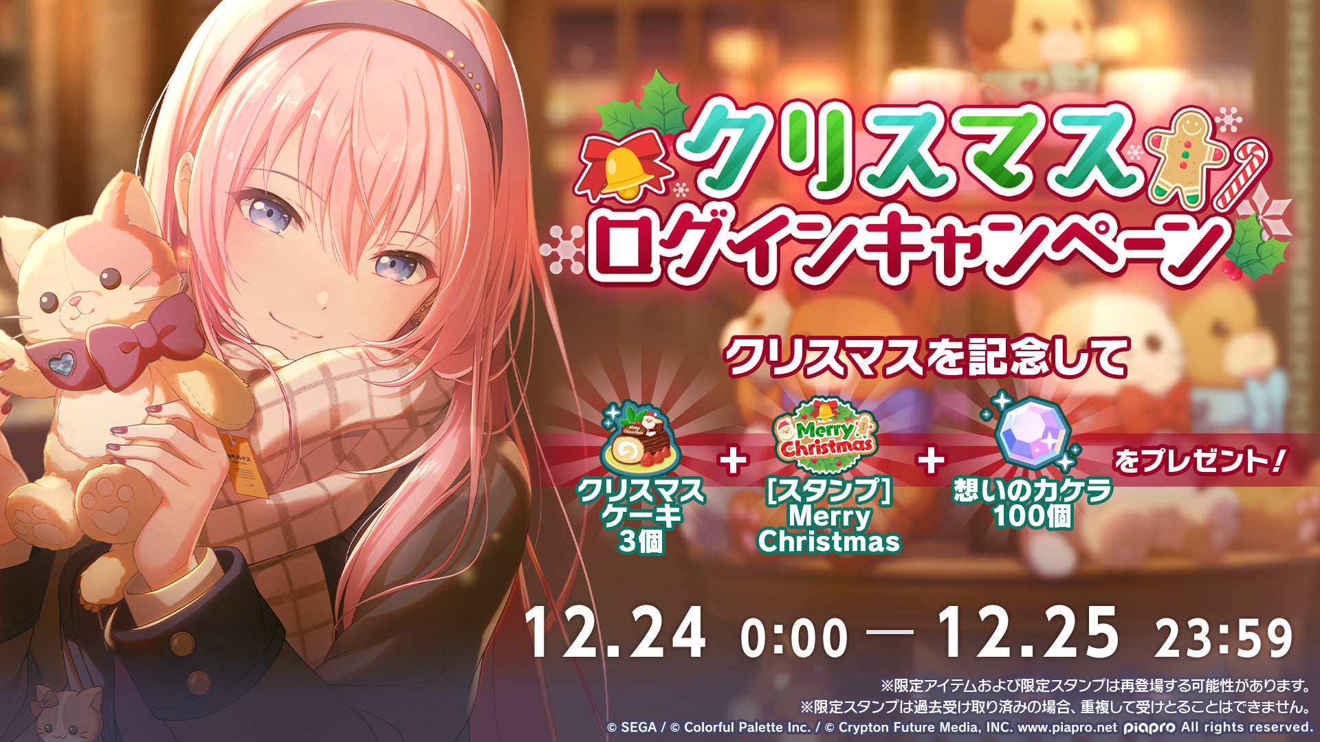 キャンペーン期間中ログインした方全員に、「クリスマスケーキ」×3個、『スタンプ「Merry Christmas」』、「想いのカケラ」×100個をプレゼントいたします。
