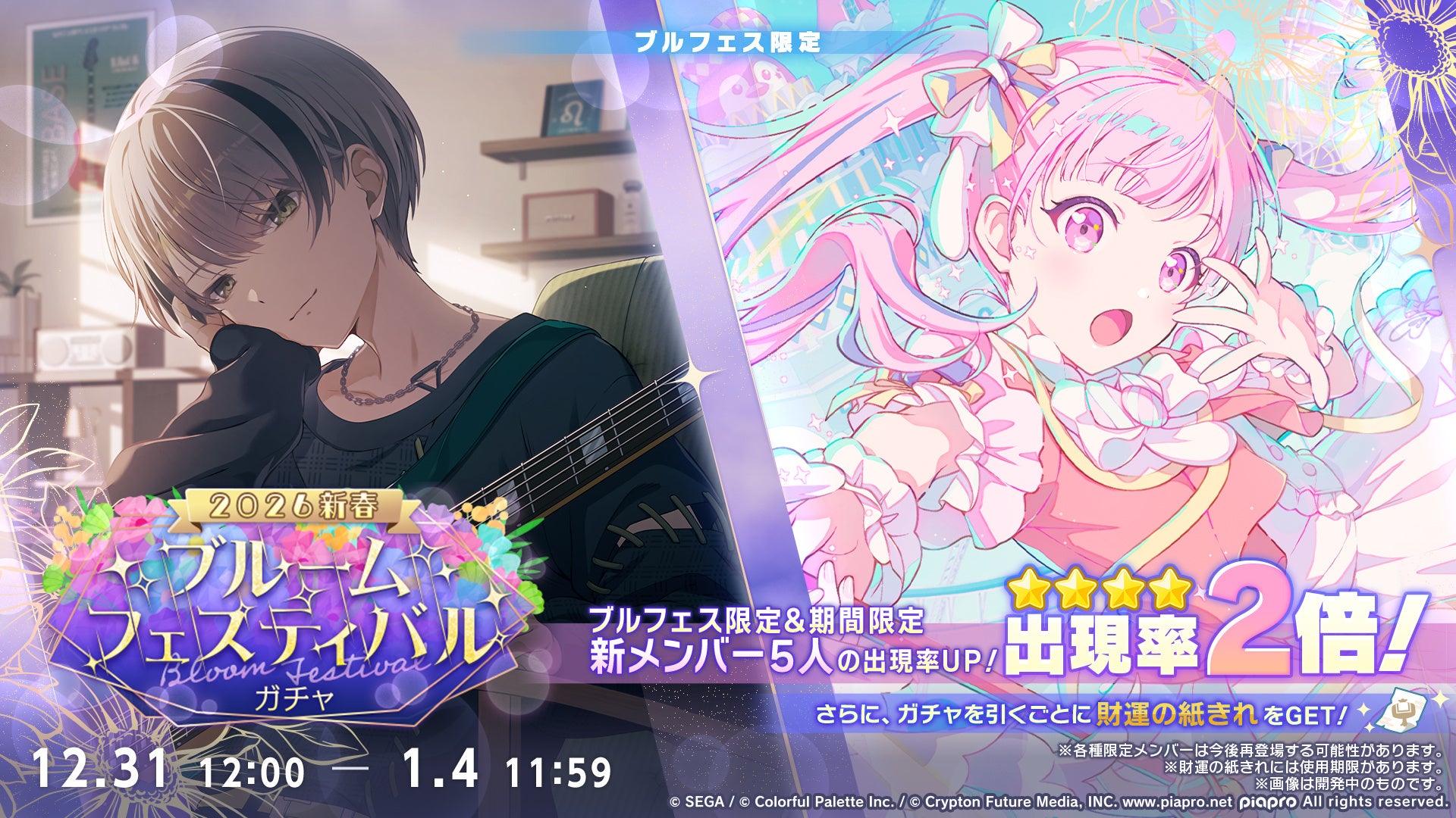★4メンバーのレアリティ別の提供割合が通常3%の2倍の6%となる「[2026新春]ブルームフェスティバルガチャ」を開催いたします。本ガチャでは、「ブルームフェスティバル限定メンバー」の日野森志歩、鳳えむの2名が新登場するほか、12月31日(水)より開催予定の「新年言祝ぐ、祈りの舞」に新登場する、期間限定メンバーの花里みのり、青柳冬弥、鏡音リンも先行登場いたします。これらの新メンバーは同レアリティ内の他のメンバーよりも出現率が高くなっております。
