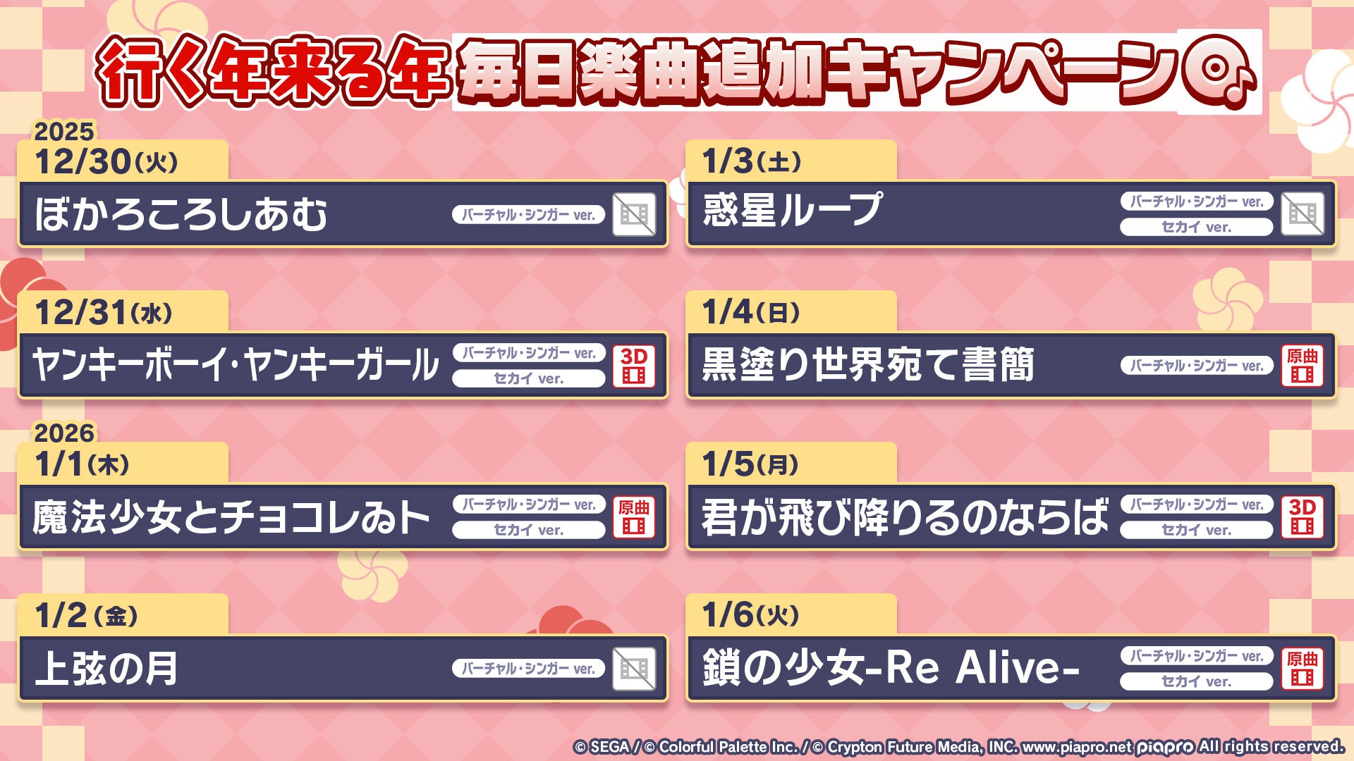 2025年12月30日(火)より、「行く年来る年毎日楽曲追加キャンペーン」として、以下8曲を8日間連続でゲーム内に追加いたします。