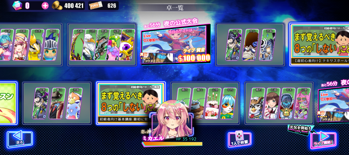 自分のポーカークラブを拡大し、凝った配信ネタは不要で日々の勝負の一喜一憂をたたえ合い報酬を得られます。配信の収益化に対応しており、視聴者課金の最大50%が配信者に還元(詳細はアプリ内)される仕組みです。