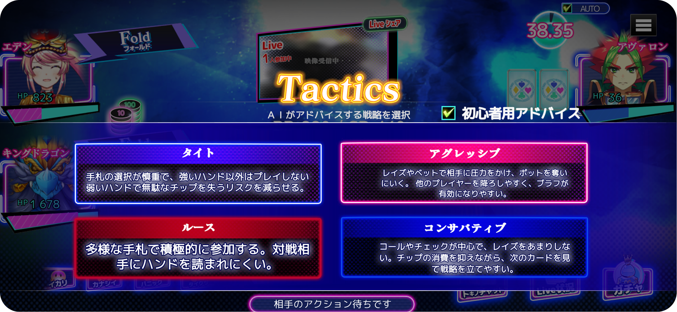 AIが役やアクションの基本を分かりやすくサポートし、「どの手札で勝負すべきか」「ここは慎重に降りるべきか」といった判断をリアルタイムで提示します。誰もが名プレイヤーの視点で思考しながら戦えるため、初心者でもポーカー本来の読み合いと戦略の深みを体感することができます。