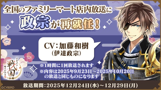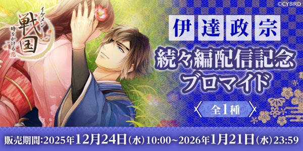 株式会社サイバード(本社:東京都品川区、代表取締役社長 兼 CEO 長嶋 貴之)が手掛ける、全世界でのシリーズ累計会員数4,500万人を誇る大人気恋愛ゲーム「イケメンシリーズ」の最新作『イケメン戦国 時をかける恋 -永縁-(読み:えいえん)』(以下、『イケメン戦国 -永縁-』)は、「伊達政宗(CV:加藤 和樹)」(以下、「伊達政宗」)の続々編ストーリーを2025年12月23日(火)12時より、配信を開始しました。
