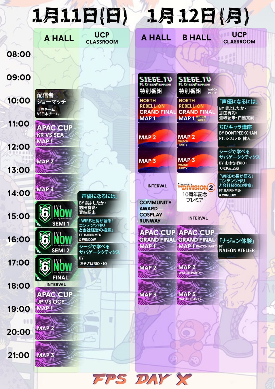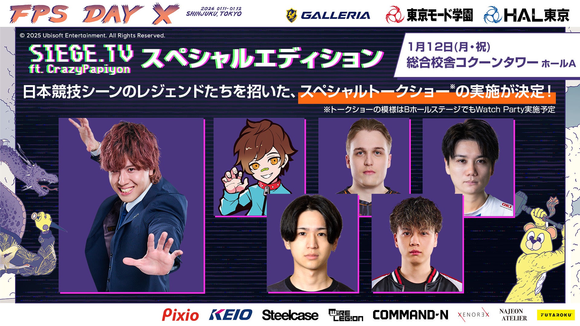 ユービーアイソフト株式会社は、1月11日(日)、12日(月)に新宿・総合校舎コクーンタワーにて開催する、Ubisoftのシューティングゲームを堪能できるイベント「FPS Day X」についての詳細を発表いたします。本イベントは東京モード学園およびHAL東京の協力により開催され、『レインボーシックス シージ』のAPAC地域eスポーツチームが対戦する「APAC Cup」のファイナルを実施する他、シリーズ1作目の発売から10周年を迎えた「ディビジョン」を祝福する、クリエイティブディレクターとゲストのおついち氏を交えての10周年記念プレミア、世界各地で予選を開催中の「1V1 NOW! アジア予選 by Xbox Gamepass」、日韓大会「North Rebellion」ファイナルなど当社タイトルに関連するステージが予定されています。また会場では、グッズの販売や各タイトルにちなんだアクティビティもご用意しています。シューティングゲームの魅力が詰まった一日を存分にお楽しみください。
