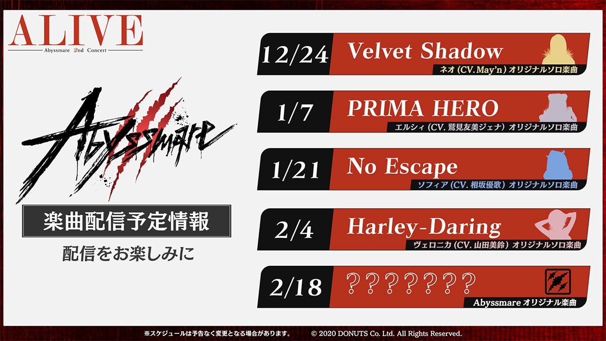 Abyssmareの新曲、および各メンバーソロ4曲の計5曲が2025年12月24日(水)より各ストアにて順次配信決定!ぜひ何度も聞いてコンサートを楽しみにお待ちください。