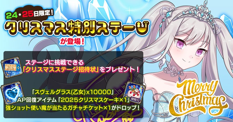 「クリスマス特別ステージ」をクリアすると、イベントアイテム「スヴェルグラス(乙女)×10000」、AP回復アイテム「2025クリスマスケーキ×1」、「強ショット使い魔が当たるガチャチケット×1」が獲得できます。