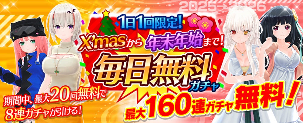 ▼最大160連ガチャ無料!【X’masから年末年始まで!毎日無料ガチャ】:2025年12月18日(木)4時~2026年1月14日(水)3時59分