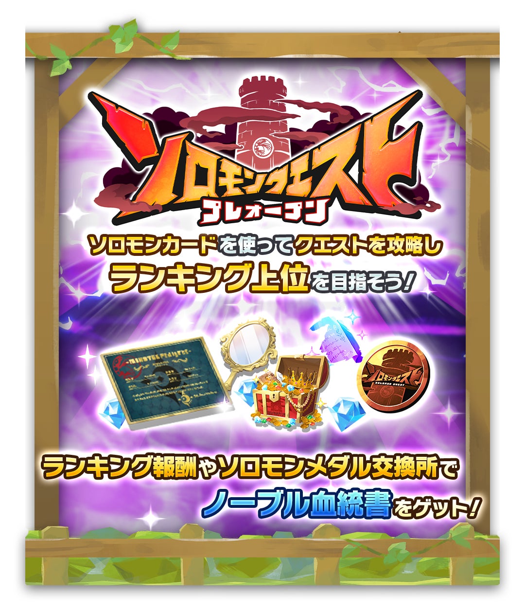 イベント「ソロモンクエスト」を開催中です。「ソロモンクエスト」は、毎月下旬に登場する新たな大型バトルイベントです。これまでの1対1バトルとは異なり、複数のモンスターで挑むパーティーバトル形式です。プレイヤーは、各地のブリーダー協会が選抜した特別なモンスター「勇者モン」とともに、4つの距離(零/近/中/遠)に分かれたクエストへ挑めます。「ソロモンクエスト」で手に入る「ソロモンの宝」をセットしてモンスターを育成すると、ソロモン秘伝を持つ「マスモン」を確実に入手できます。「マスモン」をお供に連れて、クエストの最終目標である「封印の塔」を目指しましょう。