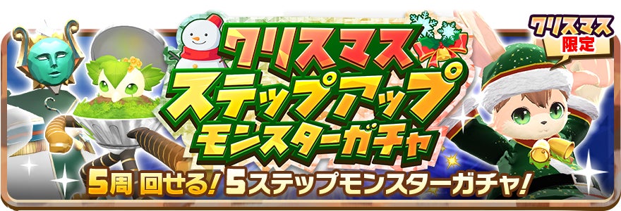 期間中開催の「クリスマスステップアップ モンスターガチャ」では、新ノーブルモンスター「ハムクロース」が登場するほか、オシリス・ステルナーのいずれか1体を獲得可能な「クリスマス円盤石」を最大で5つ獲得可能です。また、STEPごとにもらえる「ハムクロースメダル」を25枚でハムクロースが必ず獲得できる「ハムクロース円盤石」と交換できます。