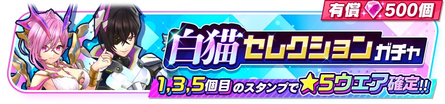 『モンスト』からはアーサー(CV:秋山絵理)、エクスカリバー(CV:小西克幸)の2キャラクターのみ、『白猫』からはオスクロル(CV:茅野愛衣)、シャナオウ(CV:福山潤)の2キャラクターのみの★5ウェアが登場するガチャを開催中です。本ガチャは有償ジュエル500個限定で5回までまわすことができ、1回目、3回目、5回目のスタンプでは★5ウェアが確定となります。それぞれのキャラクターは限定ウェアも登場します。