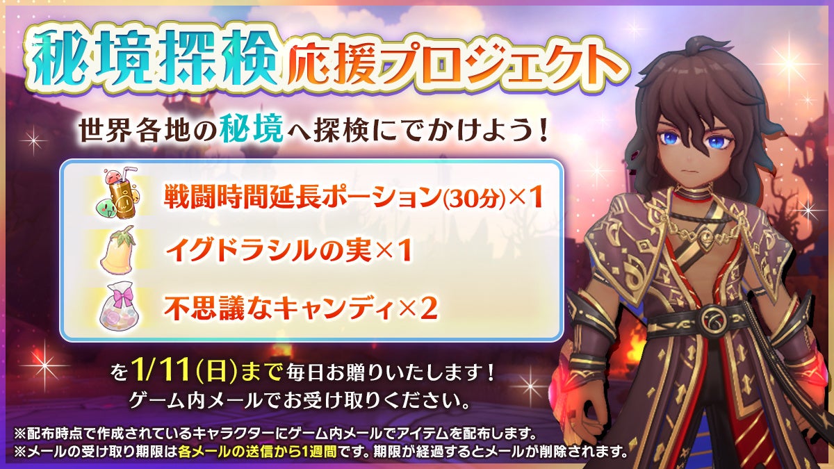 さらに、ポーションが手に入る「秘境探検応援プロジェクト」や、新頭装備「スイート・ティアラ・ケーキ」「ごろっとマンゴー帽子」が手に入る「寒中お見舞い!春待ちの贈り物」など、豪華報酬が手に入るイベントが盛りだくさんとなっています。