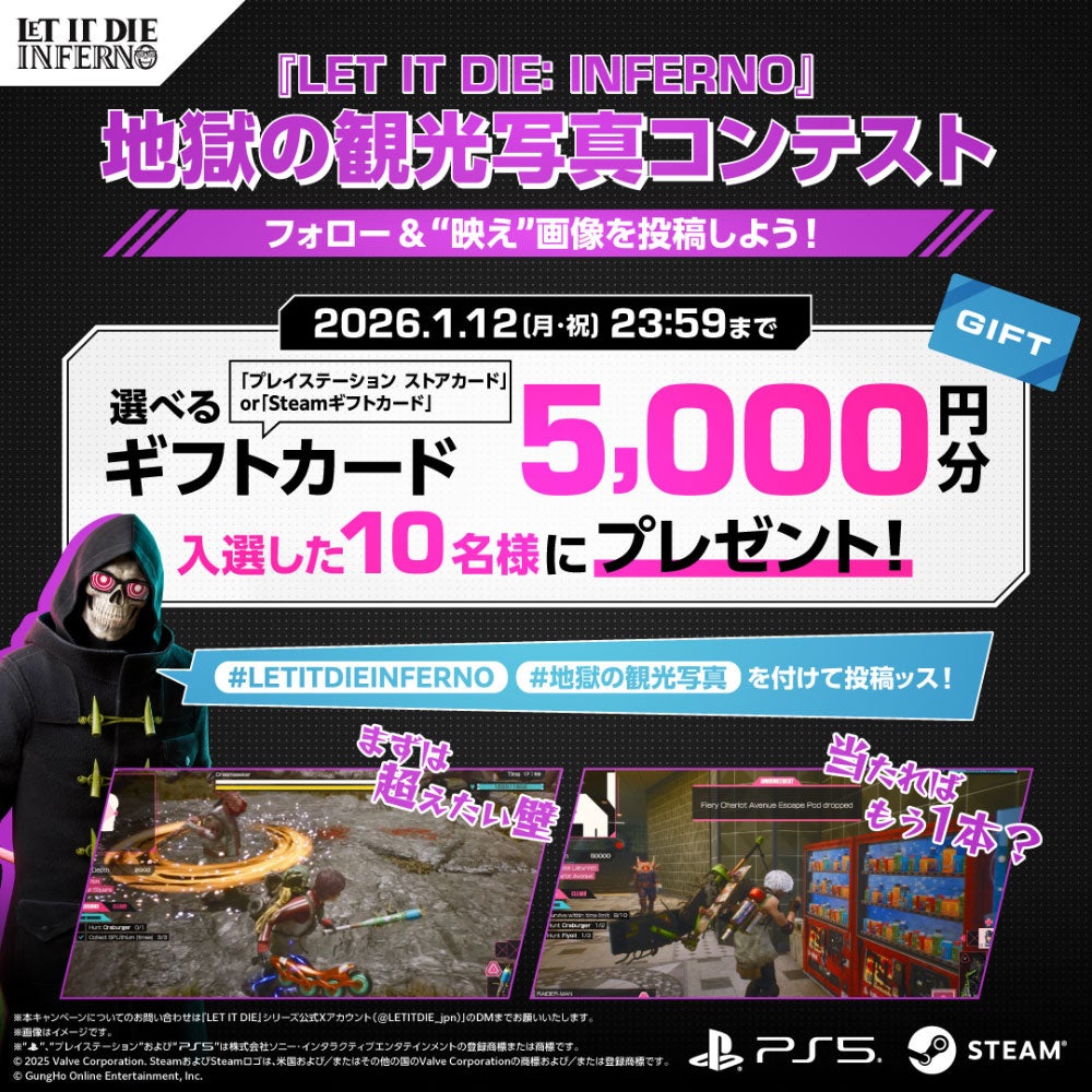 入選した10名様に5,000円分の「プレイステーション ストアカード」または「Steamギフトカード」を贈呈する「地獄の観光写真コンテスト」を実施しています。こだわりの装備、意外な絶景、まさかのアクシデント、誰も知らない珍スポットなど、撮影内容は『LET IT DIE: INFERNO』ゲーム内のスクリーンショットであればネタ・ガチ・事故、なんでもアリ!地獄の各所で撮影し、指定のハッシュタグをつけて投稿してください。