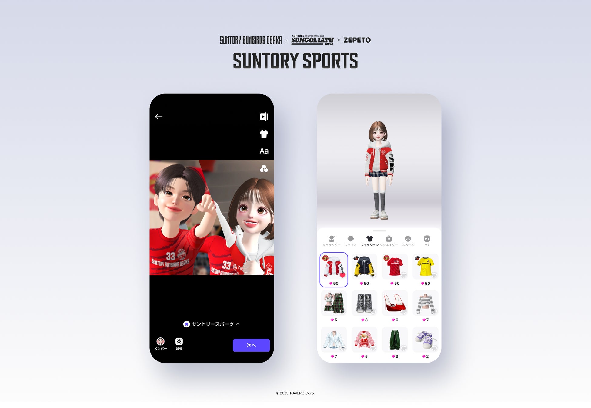 本コラボレーションでは、サントリーのバレーボールチーム「サントリーサンバーズ大阪」と、ラグビーチーム「東京サントリーサンゴリアス」にフォーカス。両チームの世界観をアバターで楽しめる限定アイテムのリリースや、ファンが選手たちを応援する気持ちを表現できるデジタルビデオブースをZEPETO内に展開します。アバターならではの自由な表現を通じて、サントリースポーツの魅力を新しい形で体験いただけます。
