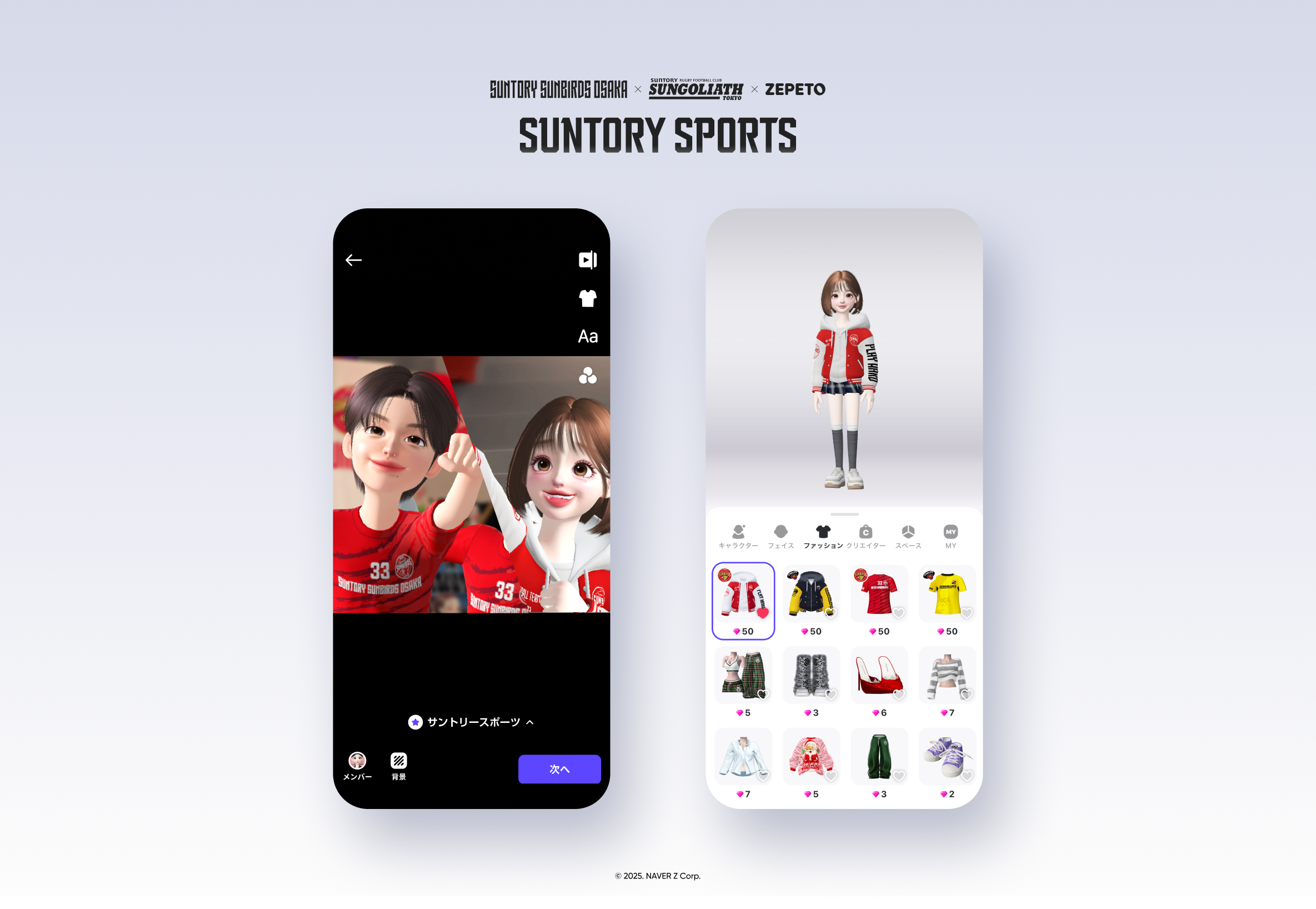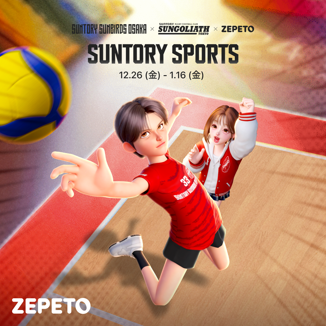 本コラボレーションでは、サントリーのバレーボールチーム「サントリーサンバーズ大阪」と、ラグビーチーム「東京サントリーサンゴリアス」にフォーカス。両チームの世界観をアバターで楽しめる限定アイテムのリリースや、ファンが選手たちを応援する気持ちを表現できるデジタルビデオブースをZEPETO内に展開します。アバターならではの自由な表現を通じて、サントリースポーツの魅力を新しい形で体験いただけます。