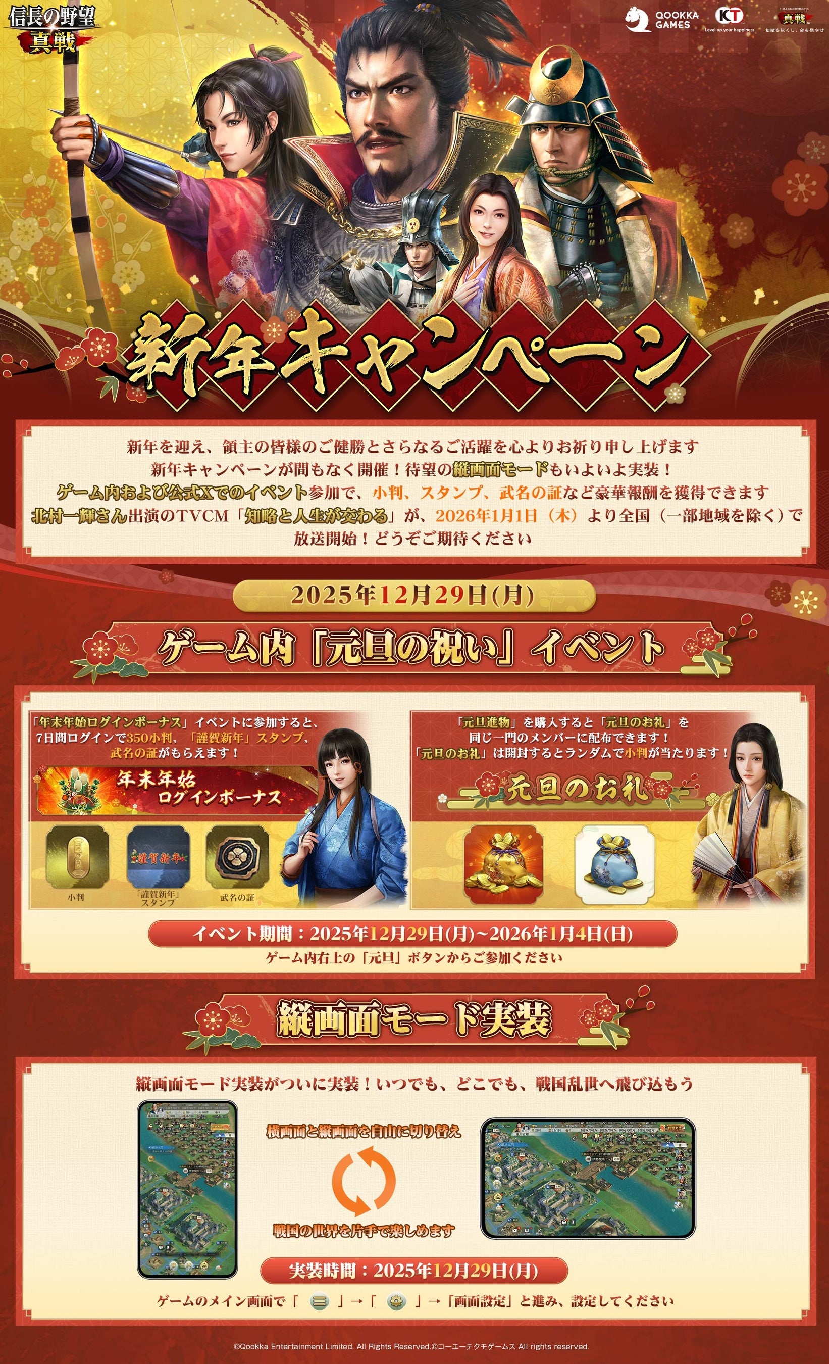 Qookka Gamesが手がける「真戦」シリーズの最新作として、コーエーテクモゲームスの『信長の野望・新生』の公式ライセンスを取得し開発したスマートフォン向けゲーム『信長の野望 真戦』にて、イメージキャラクター北村一輝さん出演のTVCMならびに大型ビジョン広告展開を開始することをお知らせいたします。また、ゲーム内では年末年始に向けた多数のイベントの開催と、縦画面モードの実装も行います。