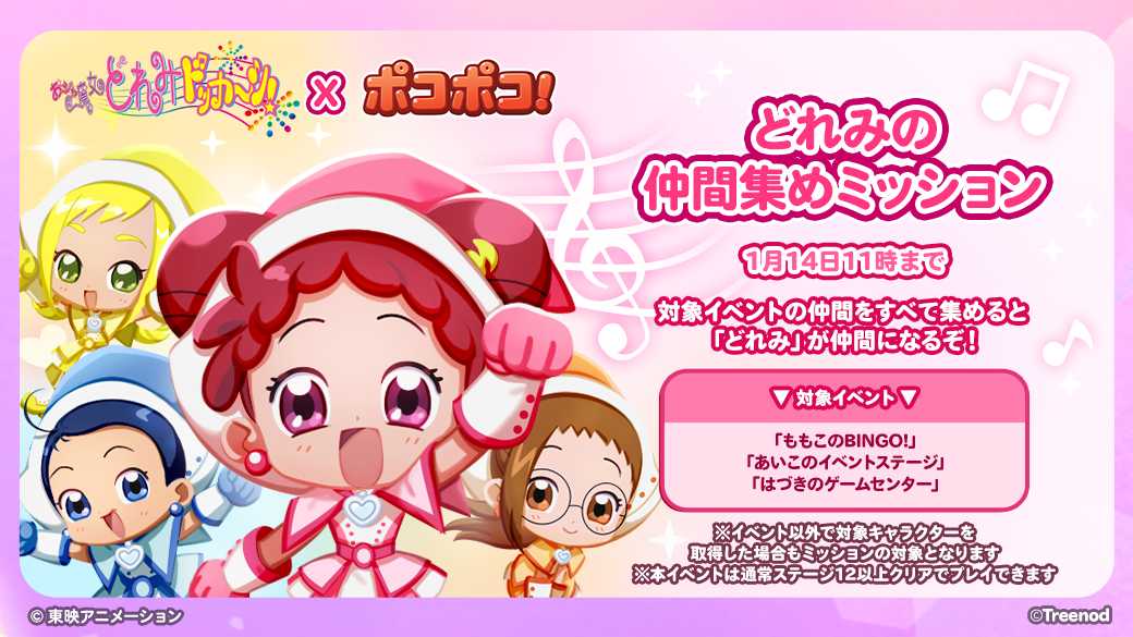 本コラボレーションでは「どれみ」「ハナ」「はづき」「あいこ」「おんぷ」「ももこ」「マジョリカ」「ララ」「ぽっぷ」がコラボ仲間として登場するほか、さまざまなコラボステージを開催します。さらに、アイテムやコラボ仲間がもらえるキャンペーンも開催します。