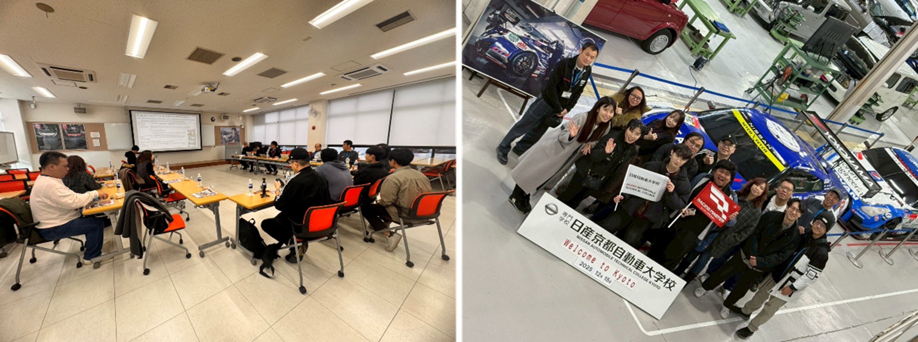 ツアー初日は、日産京都自動車大学校を訪問。整備実習施設や最新設備の紹介に加え、実際に学生が整備作業を学んでいる現場を間近で見学しました。プロを目指す学生たちの真剣な姿勢や、細部まで行き届いた実習環境に、参加者からは驚きの声が上がりました。