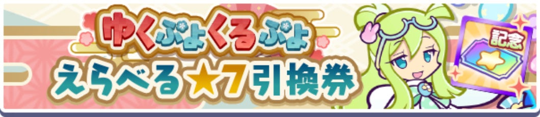 内容:配布期間中、ログインすると対象のぷよフェスキャラクターの中からお好きな★7キャラクターと交換できる「ゆくぷよくるぷよ えらべる★7引換券」がもらえます。