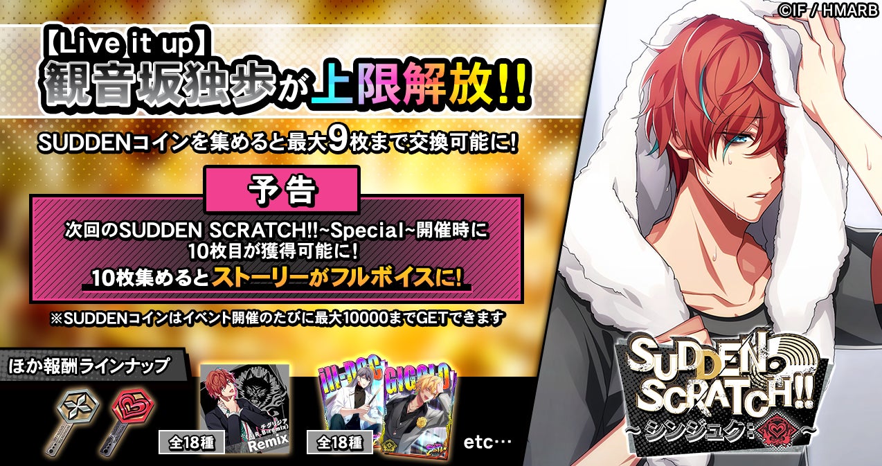 イベント期間中、KILLER SCRATCH!!をプレイするとライズ消費量に応じた確率でSUDDEN SCRATCH!!が発生します。SUDDEN SCRATCH!!をプレイすると、通常の報酬アイテムの他、限定アイテム「SUDDENコイン」を獲得することができます。「SUDDENコイン」を集めることで、「A.R.B remix」楽曲やレイズキー、シンジュク・ディビジョンのデコステッカーに使えるブースターなどと交換することが可能です。また、ストーリーカード「SSR【Live it up】観音坂独歩」が上限解放され、最大9枚まで獲得できます。さらに、SUDDEN SCRATCH!!~Special~の開催時には10枚目が獲得可能となり、10枚集めるとカードストーリーがフルボイスに!