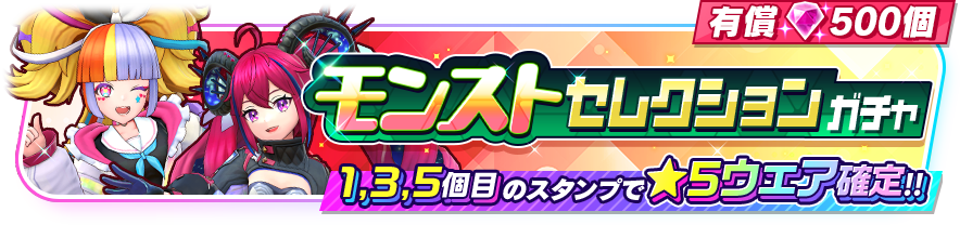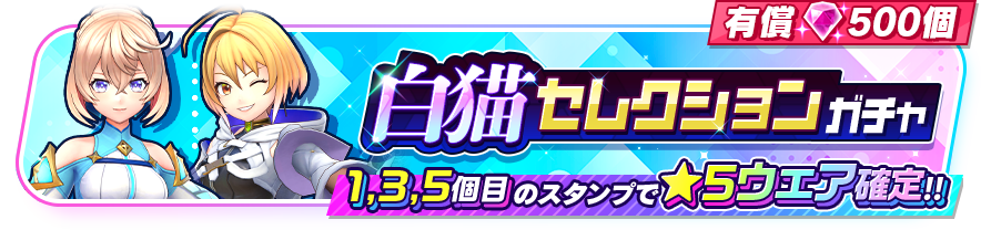 「モンストセレクションガチャ」からはジャック・ザ・リッパー(CV:高橋李依)、ラプラス(CV:鬼頭明里)の2キャラクターのみ、「白猫セレクションガチャ」からエレノア(CV:石見舞菜香)、ウィズ(CV:田村ゆかり)の2キャラクターのみの★5ウェアが登場予定です。本ガチャは有償ジュエル500個限定で5回までまわすことができ、1回目、3回目、5回目のスタンプでは★5ウェアが確定となります。それぞれのキャラクターは限定ウェアも登場します。