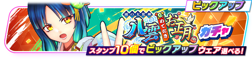 ヤクモ(CV:花澤香菜)のバトルウェアがピックアップで登場し、ヒーロー専用アクセサリーも登場いたします。スタンプ1個目で「八雲めでたきお正月★4メダル」が獲得できるなど、報酬が豪華となっております。また、次回のイベント開始まで1日1回無料でまわせます。さらに、10連ガチャを3回まで有償ジュエル350個でまわすことができます。