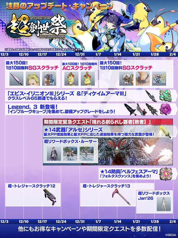 株式会社セガは、好評サービス中の『PSO2 ニュージェネシス ver.2』(以下、NGS ver.2)にて、新たなスペシャルスクラッチ「超・トレジャースクラッチVol.13」の追加をはじめとするアップデートを、2025年12月31日(水)に実施しました。