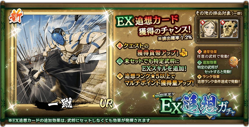 獲得することで対象武将に新たなEXスキルが解放される『EXスキル追加追想カード』が排出されます!
