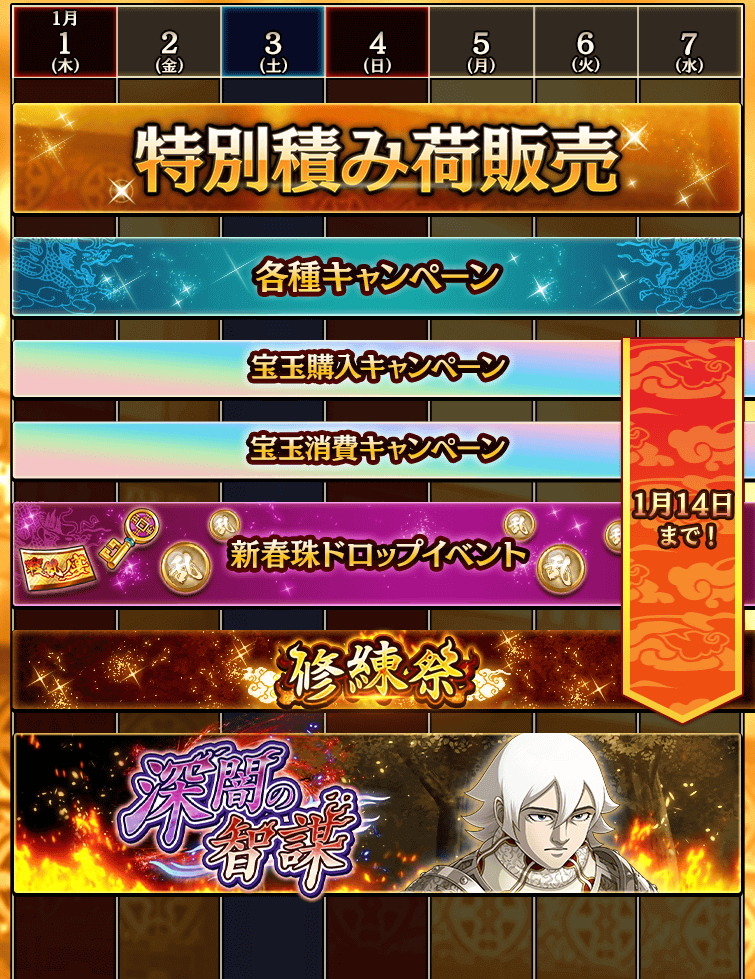 宝玉を大量に獲得できるチャンスが詰まった『【2026】開けましておめでとうパック』をはじめ、『馬』の字を持つ武将の武運をお得に集められる『午年限定!戦場を駆ける字を持つ者パック』や、爵位ポイントを通常の3倍獲得できる『正月限定!トリプル爵位ポイントパック』など、2026年の幕開けにふさわしい豪華な積み荷パックが勢ぞろいします!