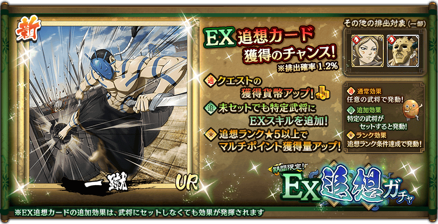 獲得することで対象武将に新たなEXスキルが解放される『EXスキル追加追想カード』が排出されます!