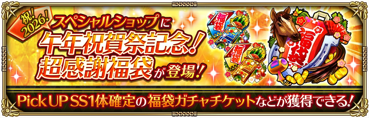 スペシャルショップにて、「祝!2026年!午年祝賀祭 Romancing祭 ナイトハルト編」、「祝!2026年!午年祝賀祭 Romancing祭 ファイアブリンガー編」のPick UPSSスタイルが1体確定で獲得できる福袋ガチャチケット ×各1などが入った、「祝!2026年!午年祝賀祭超感謝福袋」を販売いたします。