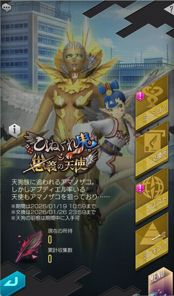 ランキングイベント“ひねくれ鬼と忠義の天使”では、期間中にイベントオリジナルのストーリーを楽しめるほか、イベントクエスト等で手に入る「天狗の羽根」を集めることで、「アマノザコの超越石」、「アブディエルの超越石」、「おいわいフロスト(加護)」などの豪華報酬を獲得できます。