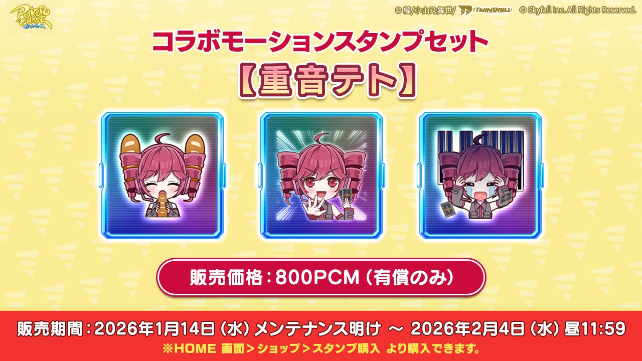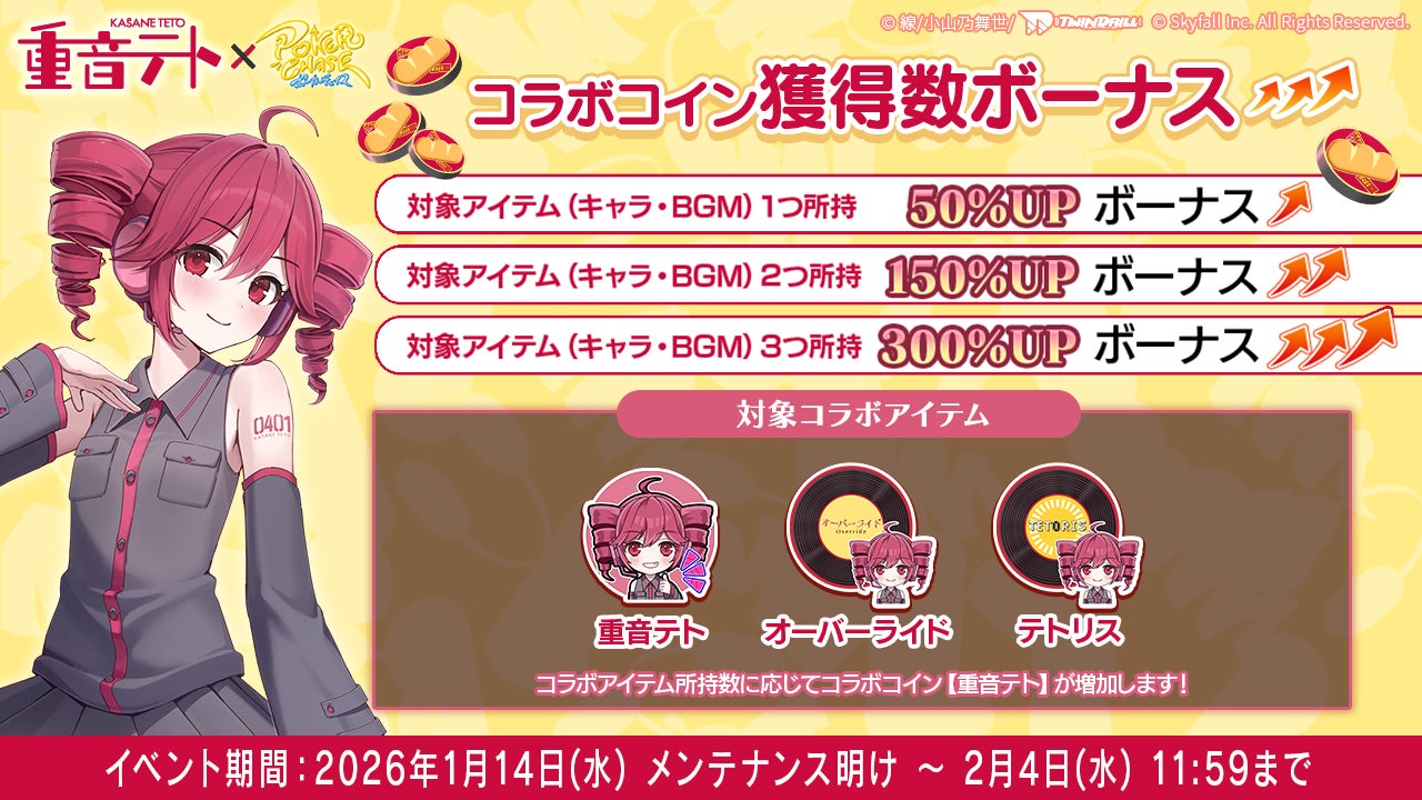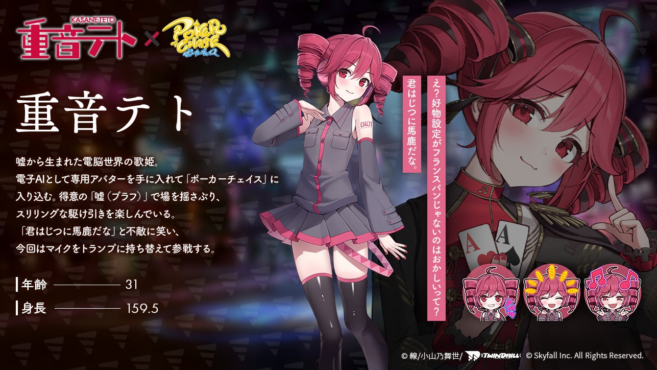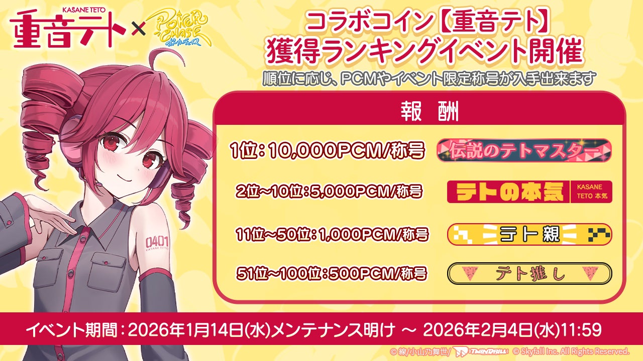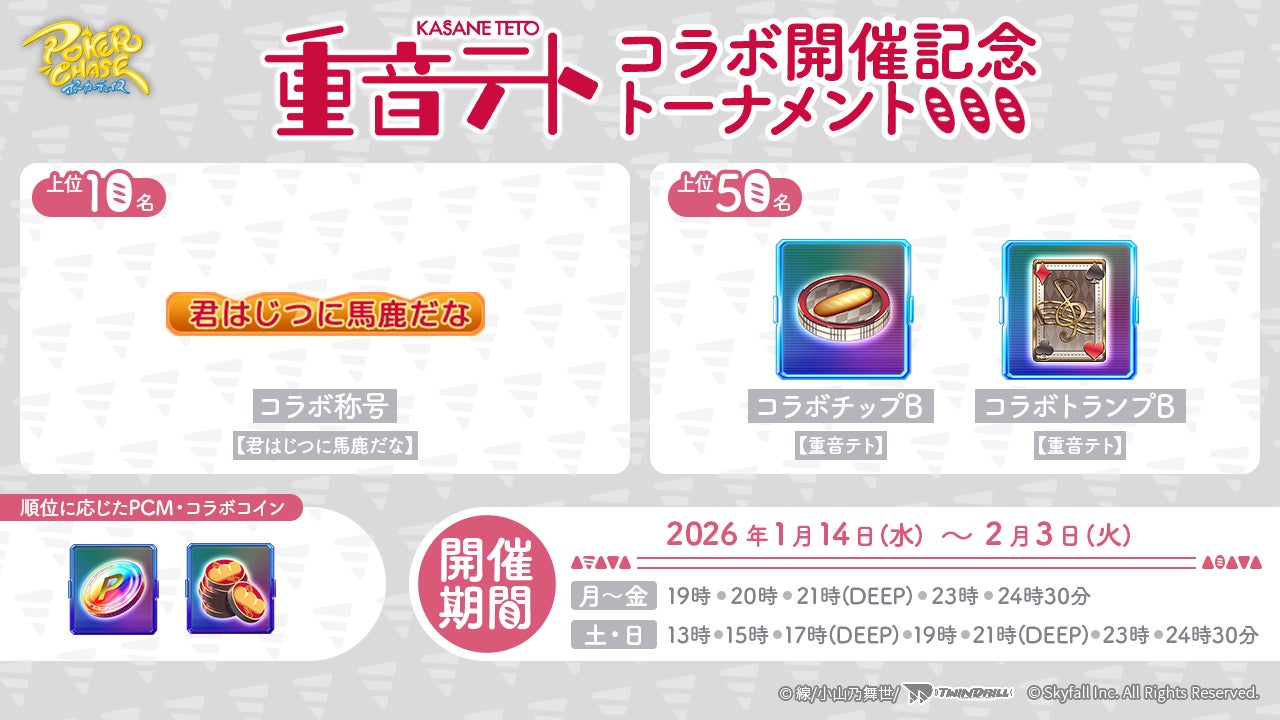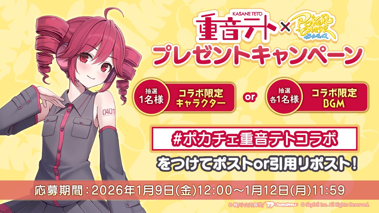 株式会社Skyfall(本社:東京都港区、代表取締役社長:長谷川 智一、以下Skyfall)が運営するバトロワ式オンラインポーカーゲーム『ポーカーチェイス』は、重音テトオフィシャルサークルツインドリルが提供する「重音テト」と、2026年1月14日(水)〜 2月4日(水)の期間限定でコラボイベントを初めて開催することが決定しました。