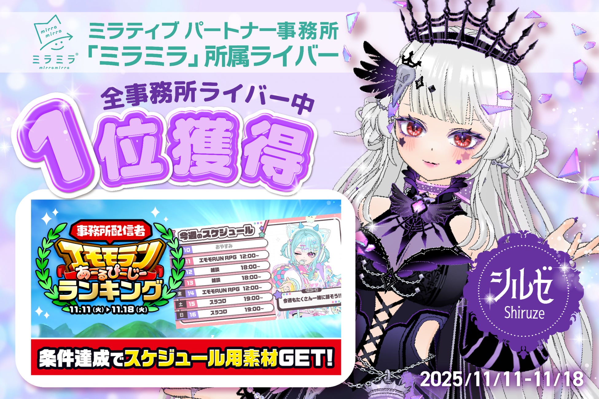 OTAGROUP株式会社(代表取締役:下西 竜二)はスマホ画面共有型ゲーム配信プラットフォーム「Mirrativ」パートナー事務所「ミラミラ」に所属するライバー「シルゼ」が2025年11月11日から11月18日に開催された「事務所配信者エモモランあーるぴーじーランキング」に参加した事務所に所属するライバーの中で1位を獲得したことをお知らせいたします。