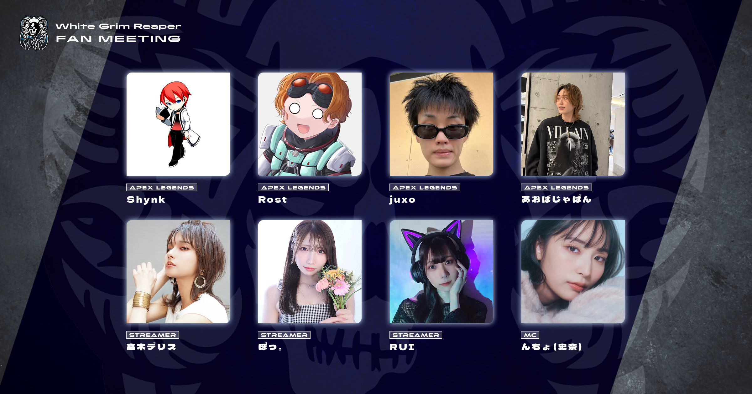 WGRとして初めてファンの皆様とオフラインで直接交流する機会として、競技シーンで活躍するAPEX LEGENDS部門の選手と、配信やイベント出演を通じて日々コミュニティを盛り上げるストリーマー部門のメンバーが一堂に会します。