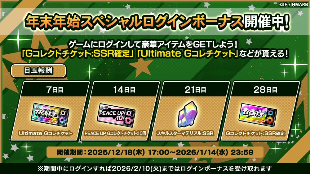期間中、「Gコレクトチケット:SSR確定」や「Ultimate Gコレチケット」などの豪華アイテムが手に入る長期間のログインボーナスを開催しています。