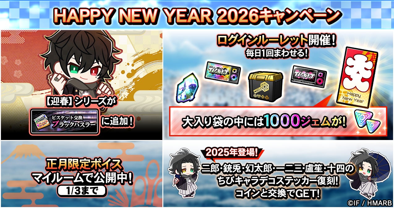 また、2025年に登場した二郎・銃兎・幻太郎・一二三・盧笙・十四のお正月デザインのデコステッカーが「デコステッカーストア~迎春~」にて期間限定で復刻されているほか、ログイン時に回せるルーレットを開催中です。