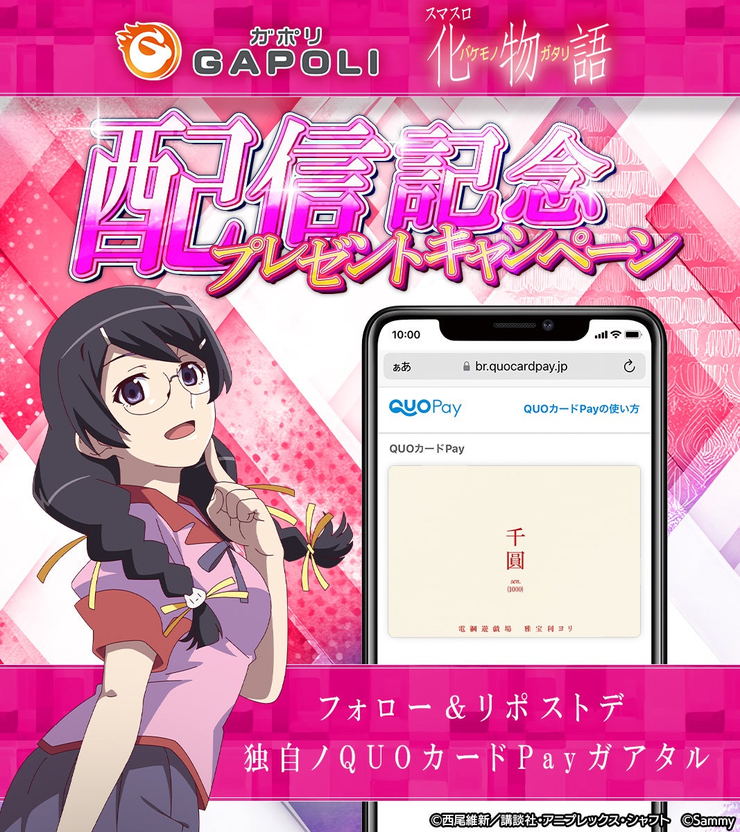 「スマスロ 化物語」の配信を記念してGAPOLI公式Xでは、フォロー&リポストキャンペーンを開催いたします。ご応募条件を満たした方の中から抽選でオリジナルデザインのQUOカードPayをプレゼント!ぜひ、ご参加ください。