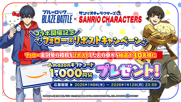 株式会社BAEL(本社:東京都新宿区、代表取締役:田村友一)は、TVアニメ『ブルーロック』を原作とするスマホゲーム『ブルーロック BLAZE BATTLE』(以下、ブレバト)にて、サンリオキャラクターズコラボイベントを2026年1月9日(金)より開催することをお知らせします。