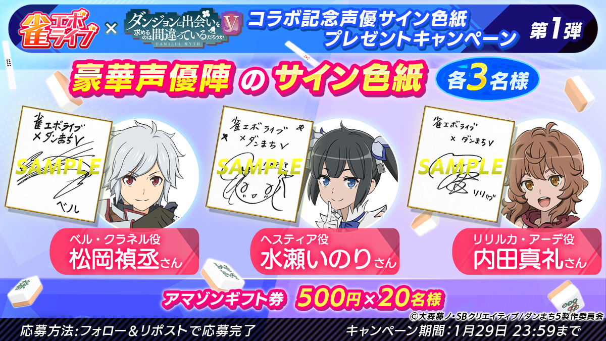 株式会社enish(本社:東京都港区、代表取締役社長:安徳孝平、以下enish)は、新感覚麻雀ゲーム『雀エボライブ』において、2026年1月16日(金)より、アニメ「ダンジョンに出会いを求めるのは間違っているだろうかⅤ」とのインゲームコラボを開始することをお知らせします。